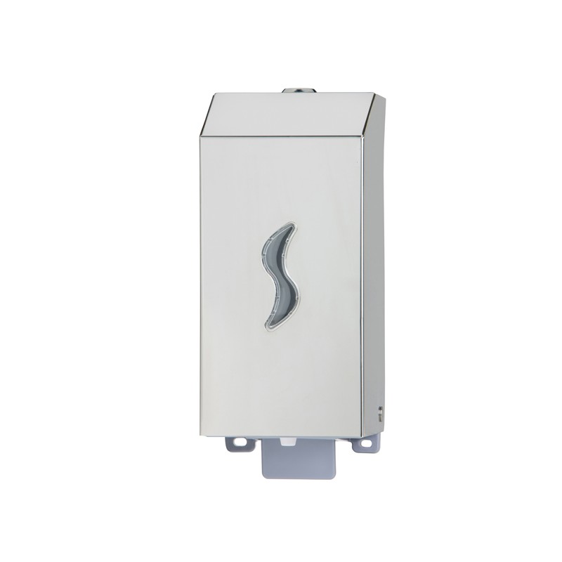 Dispenser a riempimento in acciaio inox AISI 304. Dimensioni: L9,5 X P10,5 X H22,5cm. Distributore con serbatoio in plastica a riempimento da 0,5 lt per tutti i tipi di sapone liquido, salvo quelli con microgranuli. Sistema di erogazione “pull”; Finestra per il controllo del livello del sapone; Serratura antivandalo in metallo; Kit d’installazione incluso (viteria in inox e tasselli). Effettuare una periodica manutenzione per prevenire l’ossidazione del materiale utilizzando una spugna non abrasiva e sciacquando con abbondante acqua, preferibilmente calda. Per prevenire la formazioni di macchie ed aloni è consigliabile asciugare la superficie con uno straccio di cotone. Ogni 10 o 20 pulizie ordinarie, è consigliabile utilizzare prodotti specifici per inox, in spray o crema, non aggressivi.